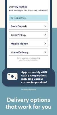 • Delivery options for money transfers include bank account money transfer, cash pickup, and digital wallet